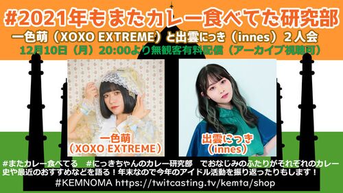 #2021年もまたカレー食べてた研究部 一色萌(XOXO EXTREME)と出雲にっき(innes)2人会 【#KEMNOMA 無観客有料配信】 日時:12月10日(金)20:00より 配信チケット:1800円(アーカイブ2週間保存) 出演:一色萌(XOXO EXTREME)、出雲にっき(innes) 進…