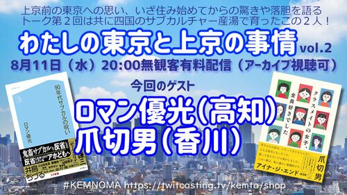 わたしの東京と上京の事情vol.2 ロマン優光(高知)&爪切男(香川) 【#KEMNOMA 無観客有料配信】 日時:8月11日(水)20:00より 配信チケット:1800円(アーカイブ2週間保存予定) twitcasting.tv出演:ロマン優光(ロマンポルシェ。、プンクボイ)、爪切…